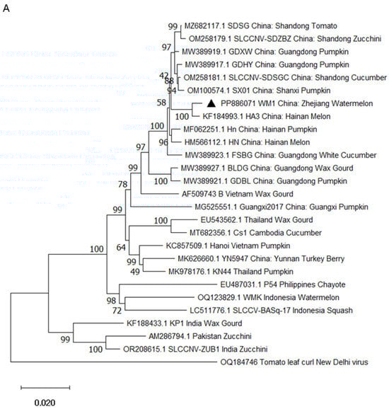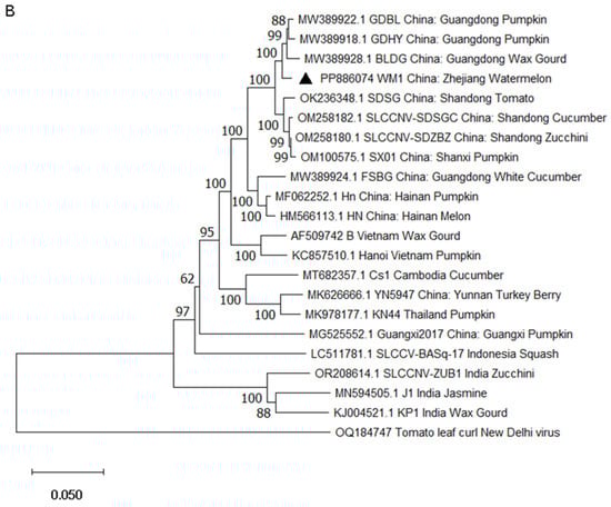 Phylogenetic trees based on alignment of the complete genome sequences of DNA-A (A) and DNA-B (B) of SLCCNV WM1 and other isolates by using the neighbor-joining method with 1000 bootstrap replicates with the MEGA X []. Tomato leaf curl New Delhi virus (ToLCNDV) is a member of the genus Begomovirus and was used as an outgroup. The SLCCNV WM1 isolate obtained in this study was labeled with “▲”.