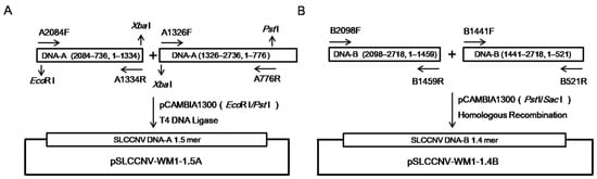Strategies for construction of the infectious clone of SLCCNV WM1 isolate. DNA-A and DNA-B components of isolate WM1 were separated into two parts for amplification, and then a DNA-A infectious clone was constructed through enzyme digestion and ligation (A), while a DNA-B infectious clone was constructed through homologous recombination (B).