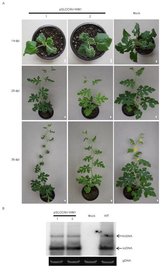The infectivity of the infectious clone of SLCCNV WM1 isolate on watermelon. (A) Symptom development on watermelon inoculated with the cloned SLCCNV WM1 at 14 days post-inoculation (dpi), 28 dpi, and 36 dpi. (B) Southern blot analysis of the diseased leaves of watermelon inoculated with the cloned SLCCNV WM1 at 36 dpi. WT indicates wild type collected from the field. linDNA indicates linear DNA, ssDNA indicates single-stranded DNA, and gDNA indicates genomic DNA. Scale bars = 1 cm.