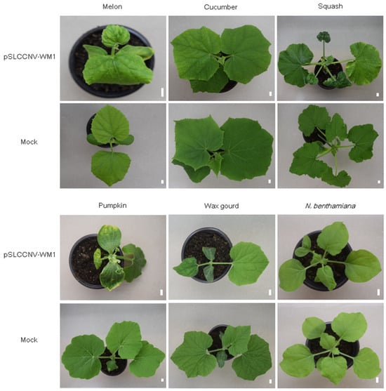 Symptom development on melon, cucumber, squash, pumpkin, wax gourd, and N. benthamiana inoculated with the infectious clone of SLCCNV WM1 at 10 dpi, 19 dpi, 14 dpi, 14 dpi, 14 dpi, and 14 dpi, respectively. Scale bars = 1 cm.