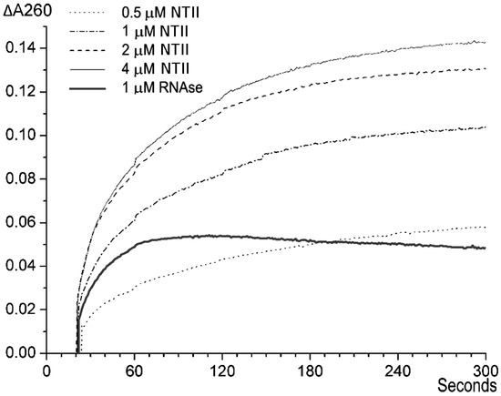 A 1% solution of NTII (or NTI, or WTX, or CTI, or CTII) to final concentrations indicated in Figure 1, Figure 2 and Figure 3 or a 1% solution of bovine pancreatic RNase A to a final concentration of 1 μM was added to 2 mL of a yeast RNA pool solution or high-molecular DNA from cattle spleen at a concentration of 1 ODU/mL in water or a 10 mM glycine buffer, pH 2.7, or Tris-HCl buffer, pH 8.0. A change in optical density was recorded at 260 nm for 10 min using a UV-2450 UV-VIS-spectrophotometer (Shimadzu, Kyoto, Japan). Each measurement was repeated at least three times.
