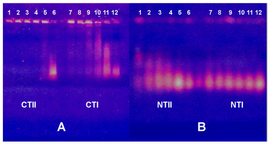 Among various methods for the investigation of nucleic acid–protein interaction, the electrophoretic mobility shift assay (EMSA, also known as the gel mobility shift or gel retardation assay) is widely used and considered a simple and very efficient method [29,30]. We used this approach to investigate changes in the electrophoretic motility of both yeast RNA and cattle spleen DNA in agarose gel after incubation with NTI, NTII, CTI and CTII (Figure 5 and Figure 6).