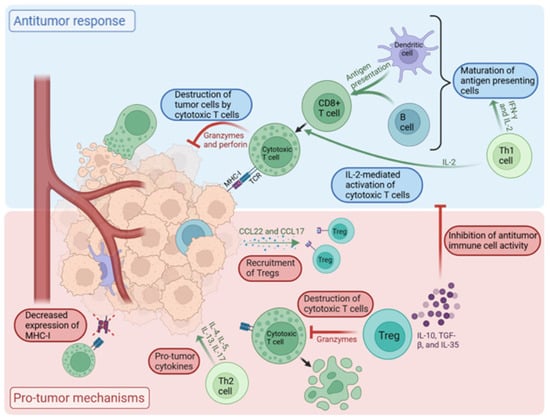 Pro- and antitumor mechanisms of TIL in the TME [17]. Antitumor responses are driven by Th1-mediated activation of CD8+ T-cells, which develop into tumor antigen-targeting CTLs. However, tumor cells employ immune evasion strategies, such as recruiting Tregs through chemokine release and downregulating MHC-I expression, to evade CTL detection. Pro-tumor cytokines released by Th2 further dampen antitumor immunity, allowing tumor cells to proliferate and metastasize. This intricate interplay governs the balance between immune surveillance and tumor escape, influencing cancer progression.