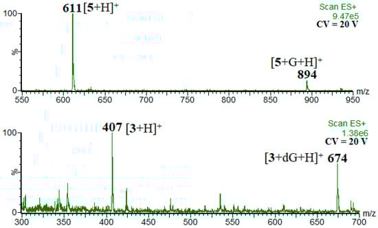 According to the obtained results, compounds 1–3 form more stable adducts with deoxyguanosine and guanosine than standards 4 and 5 (Figure 2). It has already been found that 3-O-methylquercetin forms more stable adducts with G-tetrad than quercetin [47]; therefore, 3-O-methylquercetin glycoside (1) also forms more stable adducts with dG/G than quercetin glycosides (4 and 5). Although the decrease in the [M+dG/G+H]+/[M+H]+ ratio for 1–3 is higher than that for 4 and 5, in the employed cone voltage range, the [M+dG/G+H]+/[M+H]+ ratio for 1–3 is always higher than that for 4 and 5 (Figure 2). The larger decrease in the [M+dG/G+H]+/[M+H]+ ratio for 1–3 is probably because some of the non-covalent interactions present in the adducts of 1–3 are weakened in the gas phase.