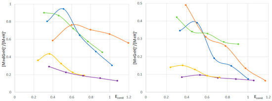 The plots of [M+dG+H]+/[M+H]+ and [M+G+H]+/[M+H]+ against Ecomδ. Blue—1, orange—2, green—3, violet—4, yellow—5.