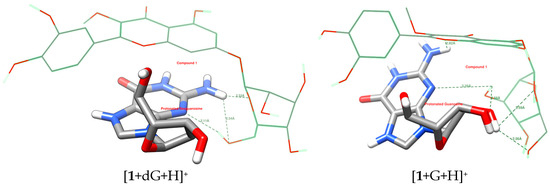 Potential hydrogen bond (green dashed lines) formation of 1 with protonated deoxyguanosine and guanosine.