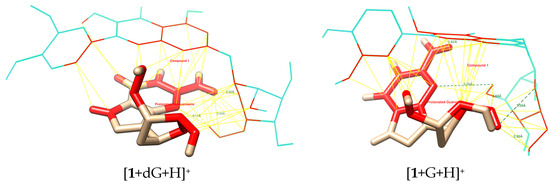 Potential interactions (especially pi-pi, yellow lines) of 1 with protonated deoxyguanosine and guanosine.