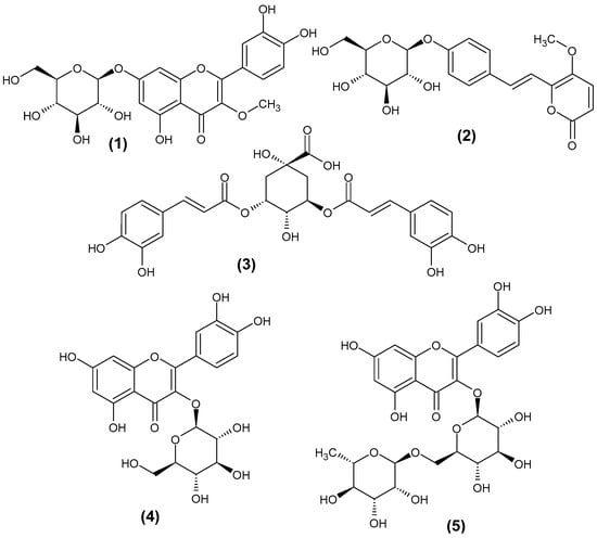 Chromatograms and mass spectra are shown in the Supplementary Materials (Figures S1–S3). As expected, for compounds 1 and 2, at longer retention times, the free aglycones (3-O-methylquercetin and 4′-hydroxydehydrokawain) were also detected (Figure S4).