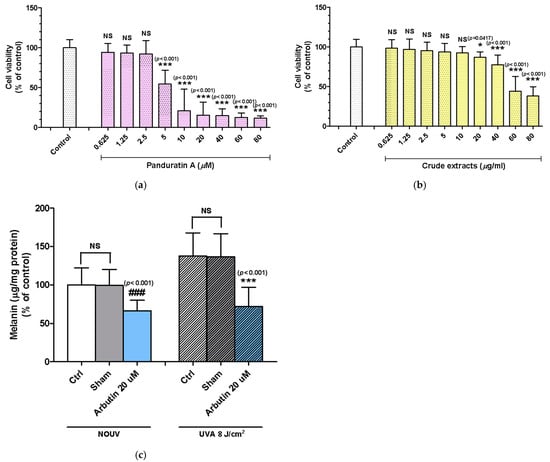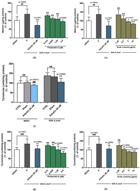 2.2. Panduratin A and Fingerroot Extract Inhibited UVA-Induced Melanin Content in B16F10 Cells