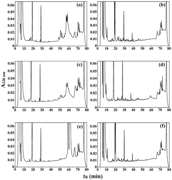 Peaks observed between the 70th and 80th minutes were not interpreted. They are defined as system peaks [], which are artifacts that do not provide information on the sample; however, they hinder the interpretation of chromatograms. The reason for this is the overlapping of system peaks with sample components having long retention times. Thus, system peaks were not taken into account in this experiment. Although this peak occurs in all chromatograms, its area varies. It is noticeable especially when comparing Figure 1c with Figure 1d and Figure 1e with Figure 1f. It is likely that some proteins from the undigested samples coeluted with the system peak at 68th min and disappeared after digestion.