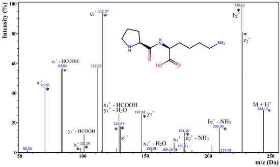 MS/MS spectrum of a PK sequence. Fragmentation ions were systematized according to the nomenclature introduced by Roepstorff and Fohlman []. Asterisks denote the fragmentation ions present in the reference spectrum of the same peptide found in the METLIN database [,].