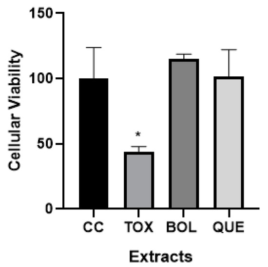 We observed that EXTs have a non-toxic effect (Figure 1) after 24 h of treatment, corresponding to the next polyphenol concentration expressed as 2 µg of GAE/mL (BOL) and 78 µg of GAE/mL (QUE). We decided to perform the EXT experiments in vitro at this dose. Only the toxicity control [TOX] showed a significant difference compared to the control cells [CC]. CC absorbance was set at 100 (100 ± 11 [CC] vs. 43 ± 2 [TOX], p < 0.05) and the values of BOL (115 ± 2) and QUE (101 ± 10) did not show a significant difference with respect to CC.