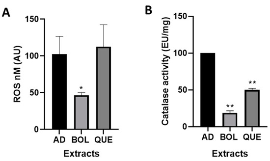 We performed a catalase activity assay to evaluate the antioxidant power of EXTs in AD and AD + EXTs. BOL and QUE treatments, after 24 h, significantly decreased the activity of the catalase enzyme compared to AD, with p < 0.01 (Figure 2B) (18.81 ± 1.93 [AD + BOL], 49.95 ± 1.61 [AD + QUE], 100.00 ± 00.00 [AD]).
