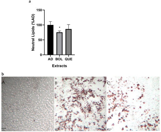 (a) Neutral lipid content of adipocytes treated with Boldo (BOL) and Quebracho (QUE) extracts (EXTs). Cells were incubated with EXTs for 24 h and stained with OIL RED O. Cells were treated with doses of EXTs: 2 µg of GAE/mL (BOL) and 78 µg of GAE/mL (QUE). Absorbance was measured at 590 ηm. Each bar represents mean ± SD of triplicate experiment. AD (non-treated adipocytes) is considered as 100%. * p < 0.05 vs. AD. (b) Oil Red O stained neutral lipid content of adipocytes treated with BOL extract. Cells were stained with ORO and photographed: (A) 3T3-L1 preadipocytes without differentiation treatment control cells; (B) 3T3-L1 non-treated adipocytes; (C) BOL extract 3T3-L1 treated adipocytes. Stained lipid droplets are shown (scale bar 0.1 cm). Representative results from one triplicate experiment with similar results are shown.
