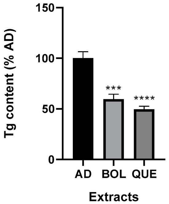 We performed AD and AD + EXT treatments for 24, 48, and 72 h to evaluate Tg intracellular accumulation. The EXTs were delivered by adding them to adipocyte culture media. BOL and QUE significantly (p ≤ 0.0001) reduced triglyceride levels after 24 h of treatment compared to AD non-treated samples. These results are shown as the percentage of non-treated adipocyte cells (AD) set at 100 (Figure 4). Tg content in AD non-treated samples was 2.01 ± 0.07 mg Tg/μg DNA; while Tg level in EXT-treated cells was significantly lower (1.19 ± 0.05 mg Tg/μg DNA [AD + BOL] and 0.99 ± 0.03 mg Tg/μg DNA [AD + QUE]). After 48 h of treatment with EXTs, only QUE decreased significantly in Tg content (p < 0.05); Tg content in AD was 41.66 ± 5.97 [AD + QUE] and 100.00 ± 4.95 [AD]. However, 72 h treatment with EXTs did not lead to significant differences.