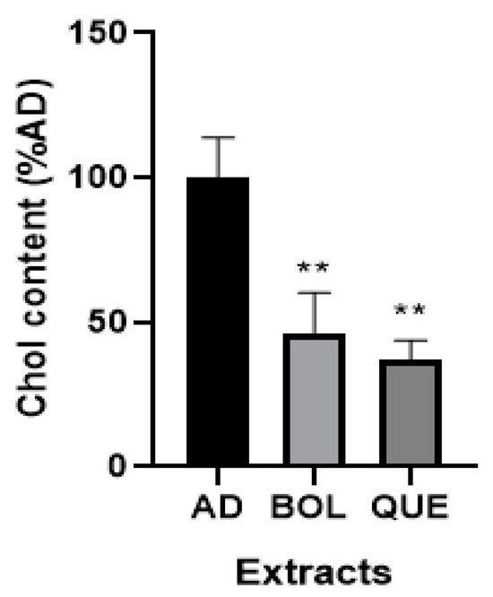 After 24 h treatment with EXTs in mature adipocytes, we evaluated Chol levels in the AD and AD + EXT samples. As shown in Figure 5, we observed that EXTs decreased intracellular Chol compared to non-treated AD (p < 0.01) (46.33 ± 7.98 [AD + BOL], 37.07 ± 3.79 [AD + QUE], 100.00 ± 7.97 [AD]). Intracellular Chol concentration in AD non-treated cells was 1.03 ± 0.08 mg Chol/μg DNA, while a significant decrease was observed for EXT-treated cells (0.47 ± 0.07 mg Chol/μg DNA [AD + BOL] and 0.39 ± 0.03 mg Chol/μg DNA [AD + QUE]).