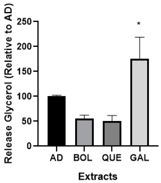 It has been reported that 3T3-L1 adipocytes release glycerol into the cell culture medium, a process referred to as basal lipolysis. We evaluated the possible effect of EXTs on lipolysis (Figure 6) after 24 h of treatment. Gallic acid (GAL) was used as a bioactive control. Only GAL treatment increased the levels of released glycerol (p < 0.05) (175.10 ± 30.97 [AD + GAL], 100.00 ± 1.60 [AD]).