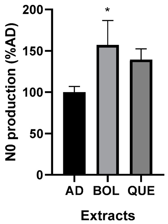 We evaluated nitrite production in adipocytes 3T3-L1 after EXT treatment and its relationship with anti-adipogenic effects. We performed treatment with EXTs for 24 h. BOL extract significantly increased Nit production compared to non-treated AD (p < 0.05) (157.00 ± 21.02 [AD + BOL], 100.00 ± 3.98 [AD]), as well as QUE. The nitrite level in AD non-treated cells was significantly different to BOL treatment (15.17 ± 0.60 μM [AD] vs. 23.83 ± 2.12 μM [AD + BOL], p < 0.05). In the case of QUE, nitrite production was 21.17 ± 0.92 μM [AD + QUE]; no significant difference compared to AD was observed. These results are shown as the percentage of non-treated adipocyte cells (AD) set at 100 in Figure 7.