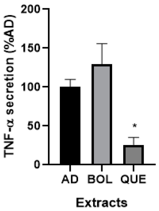 Since lipid accumulation is related to inflammation, we evaluated secreted TNF-α in our cells with high lipid content (AD) and AD + EXT (Figure 8). BOL extract did not significantly increase TNF-α secretion, while QUE extract decreased it, compared to non-treated AD (100.00 ± 8.53).