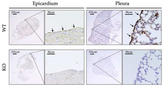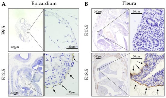 Three-micrometer-thick tissue sections were prepared from PFA-fixed and paraffin-embedded specimens. After deparaffinization, tissue sections were treated with 3% hydrogen peroxide. For antigen retrieval, tissue sections were placed in Citrate Buffer Antigen Retriever pH 6.0, heated in a decloaking chamber (Biocare Medical, Irvine, CA, USA) at 95 °C for 20 min, cooled to 70 °C, removed from the chamber, and allowed to cool to about 40 °C. The sections were then blocked with 5% normal goat serum. After blocking, tissue sections were incubated with 0.5 μg/mL primary antibody (anti-mouse C-ERC/mesothelin (308), IBL, Fujioka, Japan) overnight at 4 °C. Then, sections were incubated at room temperature for 60 min with a horseradish peroxidase-labeled polymer anti-rabbit (Envision K4003; Dako, Glostrup, Denmark) secondary antibody. Finally, the slides were incubated in 3,3-diaminobenzidine for 2–3 min. In embryos at E12.5 and later stages, the surface mesothelial cells covering the heart and lungs were identified using a light microscope to locate the epicardium and pleura. ERC immunoreactivity was observed in the epicardium but not in the pleura until E18.5. At E9.5 and earlier, anatomical structures were immature, and the entire embryos showed negative ERC staining in our analysis. This negativity is related to the fact that the epicardium is not formed before E11-12.5 []. ERC positivity was assessed by comparison with negative controls. A tissue sample was considered ERC-positive if ERC staining was observed in the mesothelial regions. In all positive cases, the majority of mesothelial cells within the stained area exhibited clear ERC immunoreactivity.