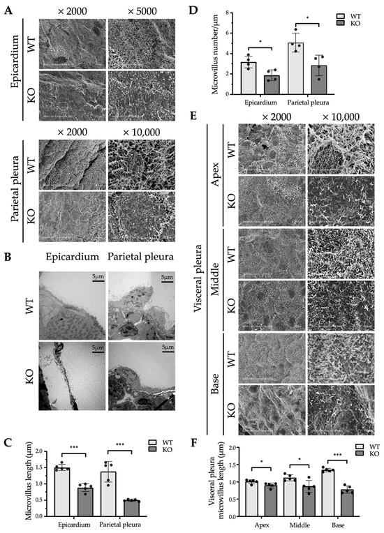Ultrastructural difference in the mesothelium between WT and Erc-KO mice. (A,B) Scanning electron microscopy (SEM) (A) and transmission electron microscopy (TEM) of (B) images of the mesothelium in the epicardium and parietal pleura of WT and Erc-KO mice are shown with magnification (SEM: epicardium, ×2000, ×5000; parietal pleura ×2000, ×10,000. TEM: ×1000). (C) Comparison of the microvillus length in the mesothelium of the epicardium and parietal pleura between WT (n = 5) and Erc-KO mice (n = 5), based on measurements from SEM images (shown in (A)), with twenty microvilli measured per mouse. (D) Comparison of the microvillus density (number of microvilli per micrometer of mesothelial surface) in the epicardium and parietal pleura between WT (n = 4) and Erc-KO (n = 4) mice, based on measurements from TEM images (shown in (B)). (E) SEM images of the mesothelium in the apical (apex), middle, and basal (base) portions of the visceral pleura of WT and Erc-KO mice are shown with magnification (×2000, ×10,000). (F) Comparison of microvillus length in the apical (apex), middle, and basal (base) regions of the visceral pleura between WT (n = 5) and Erc-KO (n = 5) mice, based on measurements from SEM images (shown in (E)), with twenty microvilli measured per mouse. Each dot represents the mean value of twenty microvillus lengths in one mouse. Values are shown as mean ± standard deviation (SD). * p < 0.05, *** p < 0.001.