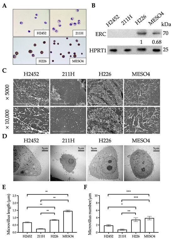 We examined the relationship between ERC expression and the ultrastructure of microvilli in four human mesothelioma cell lines []: NCI-H2452 (H2452), MSTO-211H (211H), NCI-H226 (H226), and ACC-MESO-4 (MESO4). Immunocytochemistry and Western blotting detected the endogenous expression of ERC in H226 and MESO4 but not in H2452 or 211H cell lines (Figure 4A,B). The two ERC-positive cell lines showed statistically longer and denser microvilli than the two negative cell lines (Figure 4C–F). ERC was therefore suggested to also be involved in the maturation of microvilli in cultured cells.