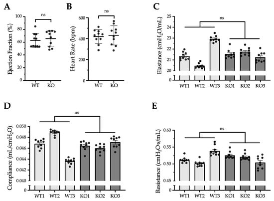 Cardiopulmonary functions of WT and Erc-KO mice. (A,B) Ejection fractions (A) and heart rates (B), analyzed by Vevo® 2100 echocardiography (Fujifilm Visual Sonics Primetech Corporation, Toronto, ON, Canada), were compared between WT (n = 10) and Erc-KO (n = 10) mice. Each dot represents the measurement obtained from an individual mouse. Values are means ± SD. bpm, beats per minute. (C–E) Respiratory elastance (C), pulmonary compliance (D), and resistance (E) were analyzed in each mouse using a flexiVent™ system and compared between WT (n = 3) and Erc-KO (n = 3) mice. Measurements were repeated nine times per mouse. Each dot represents an individual measurement. Values are shown as mean ± standard error. Statistical comparisons between WT and Erc-KO groups were performed using the mean value per mouse (WT vs. KO mean ± SD: (C) 21.5824 ± 1.2516 vs. 21.5071 ± 0.2578 cmH2O/mL; (D) 0.0464 ± 0.0227 vs. 0.0465 ± 0.0006 mL/cmH2O; (E) 0.5171 ± 0.0190 vs. 0.5168 ± 0.0111 cmH2O·s/mL). ns: not significant.