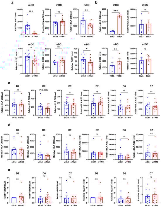 TIM3 expression positively correlates with surface maturation marker abundance in mDCs. (a) FC analysis of surface marker expression on siCtrl–mDCs and siTIM3–mDCs (n = 10 independent donors). (b) Correlation between TIM3 MFI and surface maturation marker levels (HLA-DR, HLA-ABC, CD83, CD86) in mDCs (n = 4). (c,d) FC analysis of HLA-DR and HLA-ABC on the surface (c) or after fixation (d) of mDC by TIM3 interference at days 2, 6, and 7 post intervention (n = 11). (e) qPCR quantification of HLA-DRA (MHC class II) and B2M (β2-microglobulin, MHC class I) mRNA levels. All donors are treated and compared equally with NC siRNA and TIM3 siRNA. Data are presented as mean ± SEM. Paired t-tests. ns, not significant; * p < 0.05; ** p < 0.01; *** p < 0.001.