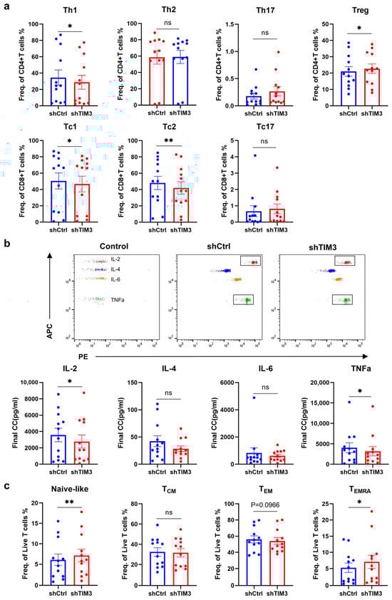The subset analysis demonstrated significantly reduced proportions of pro-inflammatory Th1 (CD4+ T-bet+) and Tc1 (CD8+ T-bet+) cells in shTIM3-DC co-cultures (Figure 2a), which were concurrent with the increased immunosuppressive Tregs (CD4+ CD25+ Foxp3+) (Figure 2a), suggesting that TIM3-deficient DCs promote an immunosuppressive alteration. Cytokine profiling revealed significantly decreased IL-2 and TNF-α secretion (p < 0.05) (Figure 2b), confirming impaired pro-inflammatory cytokine production.