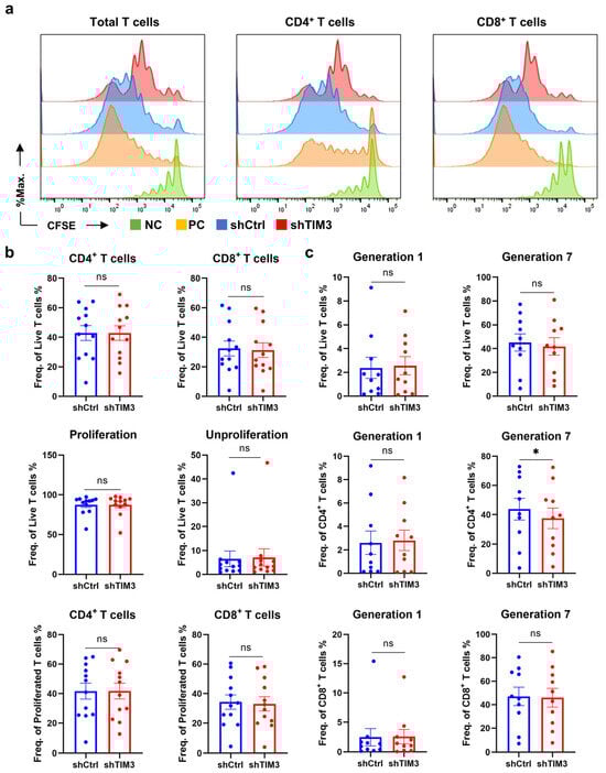 CFSE-based proliferation assays revealed proliferating T cells between groups (Figure 3b). The results showed no significant difference in the ratio of CD4+/CD8+ T lymphocytes among all living or proliferating T cells and no significant difference in the number of proliferating T cells (Figure 3a,b). However, shTIM3-DC co-cultures exhibited significantly reduced CD4+ T cells reaching the 7th generation (Figure 3c), with a non-significant trend toward slower CD8+ T-cell proliferation. This suggests that TIM3 signaling in DCs indirectly regulates clonal expansion, potentially via IL-2 autocrine pathway impairment, warranting further investigation.