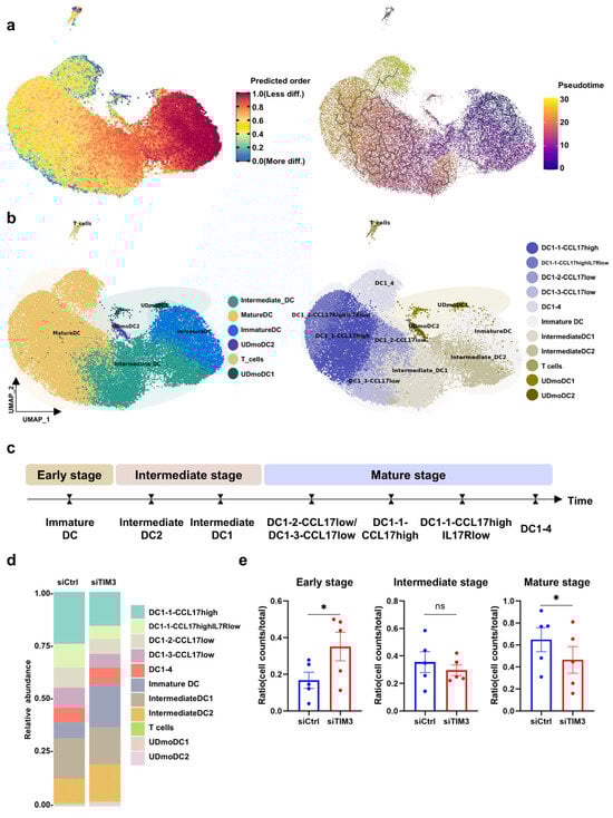 TIM3 silencing impedes DC differentiation and maturation. (a) Left: CytoTRACE plot of DC differentiation states, with color intensity reflecting the differentiation potential (red: low differentiation; blue: high differentiation). Right: RNA velocity analysis predicting the differentiation trajectories, indicated by the streamline direction (right-to-left progression in the UMAP space). (b) Left: Three-stage DC classification (immature, intermediate, mature) based on marker gene expression. Right: Subclustering of mature DCs into five subsets (DC1_2-CCL17low, DC1_3-CCL17low, DC1_1-CCL17high, DC1_1-CCL17highIL17Rlow, DC1_4) and intermediate DCs into two subsets (Intermediate_DC1/2). UDmoDC1 and UDmoDC2 subpopulations were annotated per the published nomenclature. (c) Schematic of the DC differentiation trajectory across three stages and eight subtypes. (d) Proportional distribution of DC subtypes and differentiation stages. (e) Quantification of DCs at each differentiation stage in siTIM3 versus siCtrl groups. Data derived from five healthy donors per group. Data are presented as mean ± SEM. Paired t-tests. ns, not significant; * p < 0.05.
