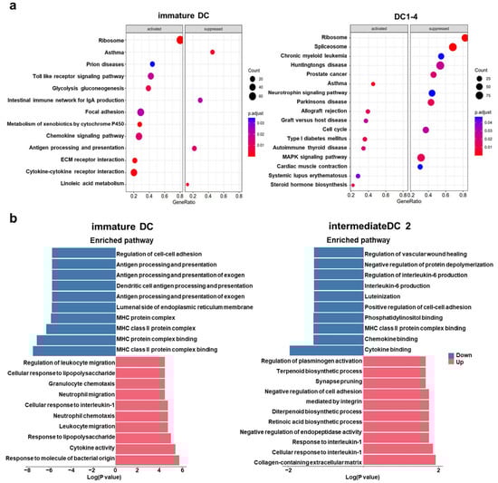 The KEGG enrichment analysis demonstrated that TIM3 signaling suppression significantly impaired the antigen-processing and presentation capacity of DCs (Figure 5a), with more pronounced inhibitory effects observed in immature DCs. Notably, mature DCs exhibited a marked attenuation of MAPK signaling pathway activity, which plays a crucial role in DC maturation []. Further supporting this, the GO analysis revealed the coordinated downregulation of antigen presentation-related pathways in immature DCs, accompanied by the reduced expression of anti-inflammatory cytokines, such as IL-6 (Figure 5b).