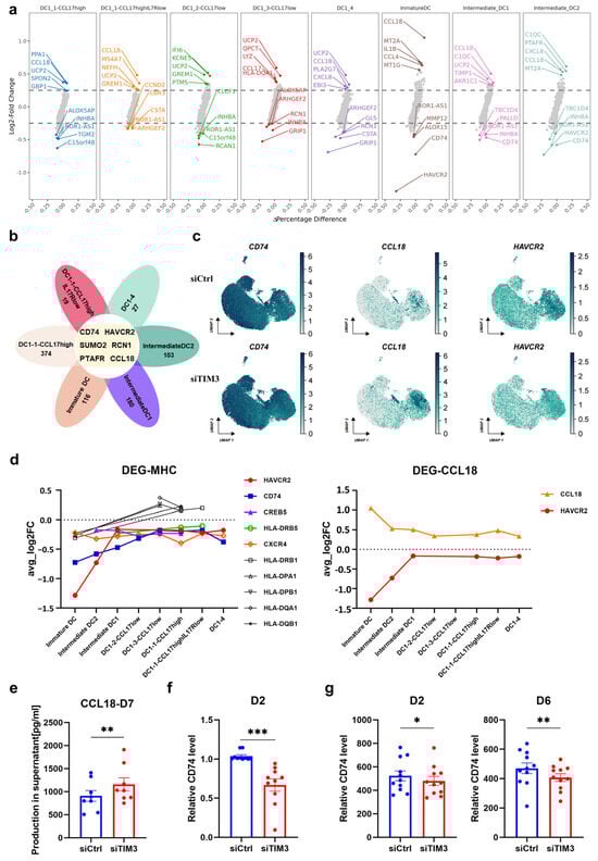A volcano plot analysis of DEGs between the siTIM3 and siCtrl groups revealed consistent transcriptional changes across the DC subsets (Figure 6a). Six genes (CD74, HAVCR2, SUMO2, RCN1, PTAFR, and CCL18) demonstrated conserved differential expression patterns, with the log2FC values consistently ranking in the top five across the analyses (Figure 6a,b). Functional validation focused on CD74, a key stabilizer of MHC II-antigen complexes, and CCL18, an immunosuppressive chemokine. UMAP visualization confirmed reduced CD74 expression and increased CCL18 levels in TIM3-deficient DCs (Figure 6c).