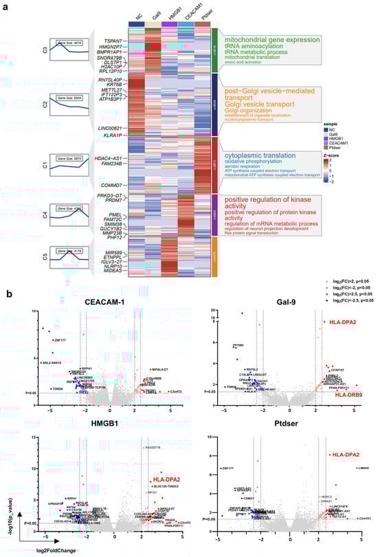 The Mfuzz cluster analysis revealed distinct ligand-specific transcriptional signatures (Figure 7a). PBS controls exhibited the heightened expression of Golgi vesicle transport pathway genes compared with ligand-stimulated groups. Gal-9 stimulation significantly elevated mitochondrial gene expression with enhanced tRNA aminoacylation, suggesting that Gal-9 stimulation enhances mitochondrial bioenergetics and the translational capacity to potentiate DC viability and activation. HMGB1-treated DCs showed the differential expression of innate immunity regulators (IGLV3-27, NLRP10), indicating that HMGB1 modulates pattern recognition responses. Ceacam-1 stimulation markedly influenced protein kinase activity and post-transcriptional mRNA metabolism, indicating its critical role in signal transduction and gene expression regulation. PtdSer treatment enhanced cytoplasmic transport and oxidative phosphorylation-driven ATP synthesis, implying improved metabolic fitness. A volcano plot analysis of DEGs identified HLA-DPA2 upregulation across the Gal-9, HMGB1, and PtdSer groups, with Gal-9 additionally inducing HLA-DRB9 expression (Figure 7b).