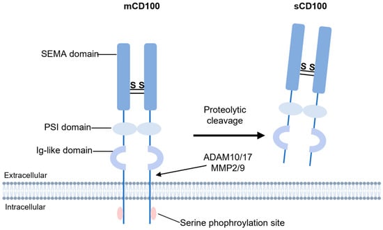 CD100 is a transmembrane glycoprotein with a molecular weight of 150 kDa, consisting of 862 amino acids []. Its structure includes three primary domains: a cytoplasmic region containing serine phosphorylation sites, a transmembrane domain, and a large extracellular region composed of multiple conserved structural motifs (Figure 1). The extracellular domain features a SEMA domain (approximately 500 amino acid residues in length), a hallmark of the Semaphorin family responsible for receptor binding, along with an immunoglobulin (Ig)-like domain and a conserved Plexin-semaphorin-integrin (PSI) domain [,]. The transmembrane domain anchors the extracellular region in the cell membrane. The relatively short intracellular region suggests that it primarily transmits signals through interactions with other signaling molecules. Proteolytic cleavage of the extracellular domain by enzymes such as ADAM10 and matrix metalloproteinases (MMP2/9) generates a soluble 120 kDa form (sCD100) [,], which acts as a ligand to mediate immunomodulatory functions. Most studies have focused on sCD100 [,,,], whereas the biological significance of membrane-bound CD100 (mCD100) remains less explored, despite its critical roles.
