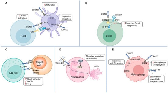 Previous research has established that CD100 primarily regulates dendritic cells (DCs) maturation and functionality through its interaction with CD72. Kumanogoh et al. [] demonstrated that DCs from CD100-deficient mice exhibit impaired interleukin-2 (IL-2) secretion [], while recombinant sCD100 administration enhances surface expression of co-stimulatory molecules (CD80/CD86) and MHC class II, along with augmenting CD40-stimulated immunogenicity. As discussed in the “T cells” section, CD100 expressed on T cells actively promotes DC activation and maturation through cellular interactions. Furthermore, emerging evidence reveals that soluble sCD100 suppresses both spontaneous and MCP-3-induced migration of myeloid-derived immature DCs. This inhibitory effect has been mechanistically linked to sCD100 binding with Plexin-B1 receptors on DC surfaces [], highlighting a novel regulatory pathway distinct from its canonical CD72-mediated signaling (Figure 2A).