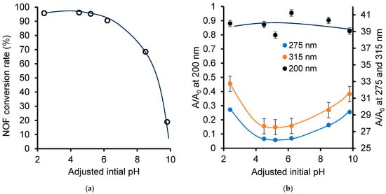 Effect of adjusted initial pH on relative UV–Vis band of NOF (a) and NOF conversion rate, as assessed through HPLC-DAD after 10 min of non-catalytic ozonation (b). The adjusted initial pH was measured with a ±0.2 accuracy that is overlapped by the mark width.
