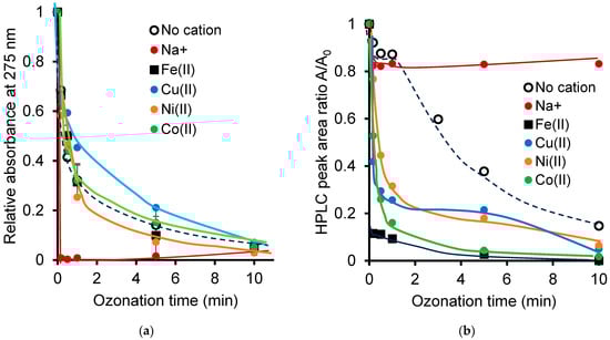 In NOF ozonation, this pH decay was found to decrease in the following sequence Fe2+(3.65) > Co2+(3.15) > Cu2+(3.08) > water (2.87) > Ni2+(2.72) > Na+(1.46) and is potentially due to the production of acidic ozonation product. Unlike Na+ cation, nanopure water seems to behave similarly to the other cations, as reflected by similar decays in the 275 nm band absorbance (Figure 2a) and residual HPLC peak ratio of NOF during ozonation (Figure 2b).