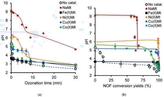 As previously stated, significant changes in the UV–Vis spectrum were observed after only 10 min of NOF in water (Figure S2). Simultaneously, the initial pH decreased from 5.28 to approximately 3.65 after only 1–2 min (Figure 3a) for an NOF conversion not exceeding 10–12%, most likely due to an early formation of acids. A correlation attempt revealed that the pH of the ozonation mixture remains constant until certain threshold values of the NOF conversion yield (Figure 3b). Non-catalytic ozonation showed a long and slightly inclined plateau to a pH of 3.2 and an abrupt drop down to 2.44 for NOF conversions of ca. 84.12% and 95.96%, respectively. The shape of the pH profile suggests the occurrence of a two-step ozonation process with NOF conversion, mainly into acid species, sandwiching an intermediate step with less acid production.