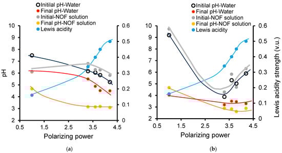 The effect of cations is mainly related to their polarizing power (PP), usually and often expressed as (Charge)/(Ionic radius in Å)2, being directly proportional to the charge on a cation and inversely proportional to the size of the cation. This factor determines the Lewis acidity strength of the cation and, therefore, its capacity to be neutralized by hydration water molecules that act as Lewis bases and undergo dissociation with proton release [58,59]. This explains why the lowest PP of the Na+ cation (1.0) promotes almost no interaction with water molecules and no acidity in aqueous media.