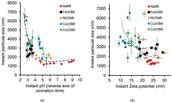 The initial pH and Zeta potential (ZP) evolve during ozonation and greatly influence the [clay–clay] and [NOF–clay] interactions and their contributions to the catalytic process. Here also, no clear correlation between the instant PS and ZP can be established for each clay catalyst. This is due essentially to the PP of each exchangeable cation that governs its Lewis acidity and, consequently, the number of hydration molecules and their dissociation into free protons [58,59]. Yet, there exists a vague reverse proportionality between both parameters when correlating all the data for all the catalysts together (Figure 5b). Indeed, the clay particle size appears to somehow increase with the increasing ZP during NOF ozonation, as a result of pH decay.