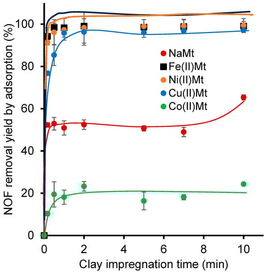 In the absence of ozone, Fe(II)Mt and Ni(II)Mt showed their highest NOF adsorption yields, reaching equilibrium at ca. 99% and 99.4%, respectively, after only 1 min of contact time (Figure 6). Fe(II)Mt showed a slightly slower NOF adsorption, reaching surface saturation at approximately 97–97% after 2 min of contact time. Deeper insights into the adsorption mechanisms were achieved by applying kinetic models, which revealed that the process occurs mainly via the pseudo-second order, based on the closest correlation coefficient values (R2) to unity (Table 3).