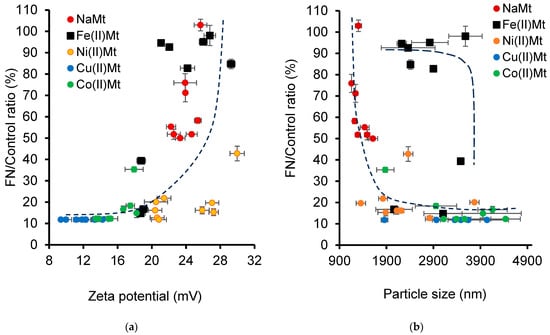 The pH evolution over time should be a key-factor in governing the surface charge and clay dispersion, which, in turn, control their very catalytic activity, ozonation process advancement, product distribution, and consequently, the toxicity of the ozonized NOF mixture. In this regard, the Zeta potential and particle size measurements may provide valuable information on the toxicity of heavy metals and organic pollutants [78,79,80]. This narrow interdependence between all these factors can be illustrated by an increasing tendency in the FN/Control ratio with increasing Zeta potential (Figure 7a).