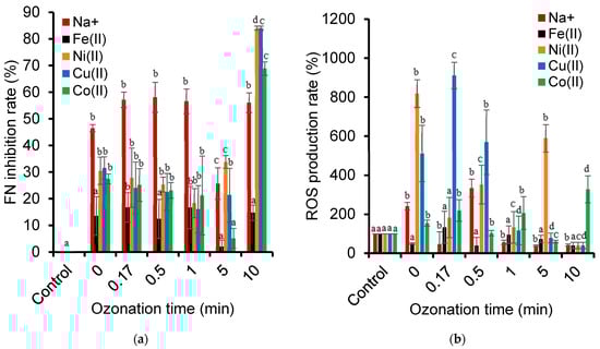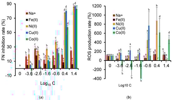 It is worth mentioning that Co2+ displayed the lowest FN inhibition rate and ROS production at a low concentration of around 25 × 10−4 ppm. At this concentration, Co2+ is known to act as a micronutrient that stimulates plant growth. Co2+ at concentrations higher than 0.059 ppm was already found to inhibit L. minor growth by inhibiting iron transport from the roots to shoots without affecting iron uptake [82]. Other metal cations, such as Cu2+, can exhibit toxicity towards Lemna minor, even at low concentrations, by favoring the activity of the antioxidant enzymes catalase and guaiacol peroxidase [83]. Plants are known to raise the activity of their antioxidant defense systems in response to oxidative stress that reduces the ROS levels.