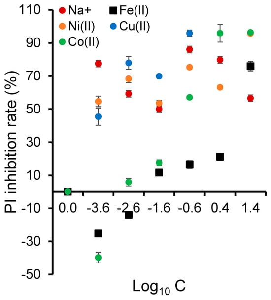 Here, the toxicity towards L. minor unavoidably included that of the metal cations, which was reflected by the increasing frond number (FN) inhibition rate and the production of oxygen reactive species (ROS) with the increasing cation concentration, expressed in terms of Log10 C (Figure 8). This phenomenon was a common behavior for all the metal cations but was increasingly more pronounced for Co2+, Ni2+, and Cu2+ with the increasing concentration.