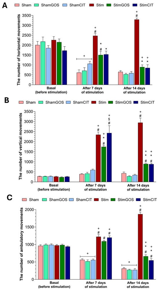 Effects of GOS supplementation or CIT administration on locomotor activity expressed as the number of horizontal (A), vertical (B) and ambulatory (C) movements in the actometer at three time points: basal (before stimulation), after 7 days and after 14 days of stimulation in rats subjected to long-term electrical stimulation of the CeA or sham stimulation. Data are expressed as the mean ± SEM; n = 8 animals/group. Explanations: # p < 0.05 stimulated vs. sham rats within the same supplementation group (Stim vs. Sham; StimGOS vs. ShamGOS; StimCIT vs. ShamCIT); * p < 0.05 certain stimulated and supplemented groups vs. Stim; $ p < 0.05 StimGOS vs. StimCIT; + p < 0.05 the certain time point vs. previous within the same experimental group using three-way ANOVA followed by Tukey’s post hoc test.