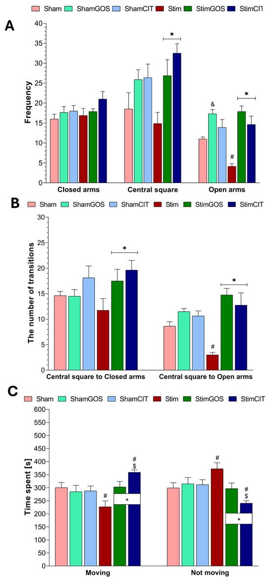 Effects of GOS supplementation or CIT administration on the anxiety level, expressed as the frequency in closed arms, the central square and open arms of the maze (A); the number of transitions between the central square and closed/open arms (B); and the time spent on moving and not moving (C) in the elevated plus maze in rats subjected to long-term electrical stimulation of the CeA or sham stimulation. Data are expressed as the mean ± SEM; n = 8 animals/group. Explanations: # p < 0.05 stimulated vs. sham rats within the same supplementation group (Stim vs. Sham; StimGOS vs. ShamGOS; StimCIT vs. ShamCIT); * p < 0.05 certain stimulated and supplemented groups vs. Stim; $ p < 0.05 StimGOS vs. StimCIT; & p < 0.05 certain sham-stimulated and supplemented groups vs. the Sham group using two-way ANOVA followed by Tukey’s post hoc test.