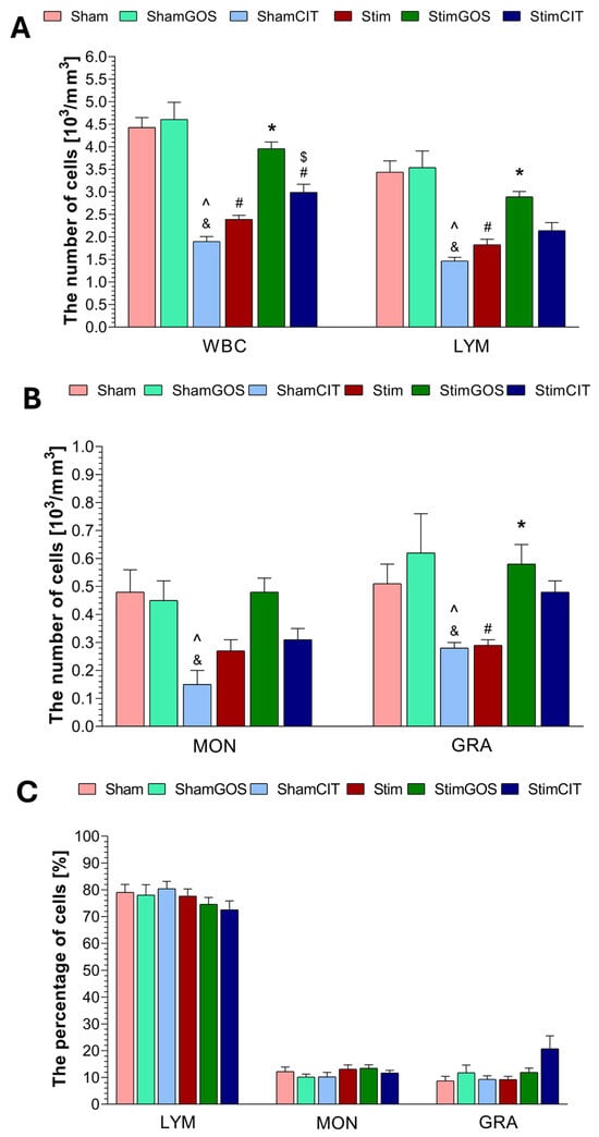 Effects of GOS supplementation or CIT administration on the white blood system: the number of white blood cells (WBCs), lymphocytes (LYMs) (A), monocytes (MONs) and granulocytes (GRAs) (B) and the percentage of LYMs, MONs and GRAs (C) in the peripheral blood of rats subjected to long-term electrical stimulation of the CeA or sham stimulation. Data are expressed as the mean ± SEM; n = 8 animals/group. Explanations: # p < 0.05 stimulated vs. sham rats within the same supplementation group (Stim vs. Sham; StimGOS vs. ShamGOS; StimCIT vs. ShamCIT); * p < 0.05 certain stimulated and supplemented groups vs. Stim; $ p < 0.05 StimGOS vs. StimCIT; & p < 0.05 certain sham-stimulated and supplemented groups vs. the Sham group; ^ p < 0.05 ShamGOS vs. ShamCIT using two-way ANOVA followed by Tukey’s post hoc test.