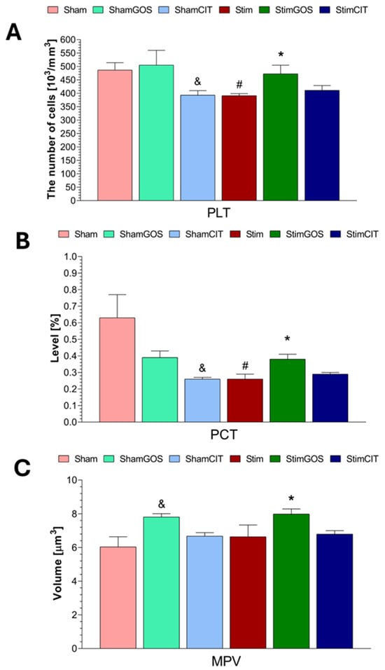 Effects of GOS supplementation or CIT administration on the platelet system: the number of platelets (PLTs) (A), plateletcrit (B) and mean platelet volume (MPV) (C) in the peripheral blood of rats subjected to long-term electrical stimulation of the CeA or sham stimulation. Data are expressed as the mean ± SEM; n = 8 animals/group. Explanations: # p < 0.05 stimulated vs. sham rats within the same supplementation group (Stim vs. Sham; StimGOS vs. ShamGOS; StimCIT vs. ShamCIT); * p < 0.05 certain stimulated and supplemented groups vs. Stim; & p < 0.05 certain sham-stimulated and supplemented groups vs. the Sham group using two-way ANOVA followed by Tukey’s post hoc test.