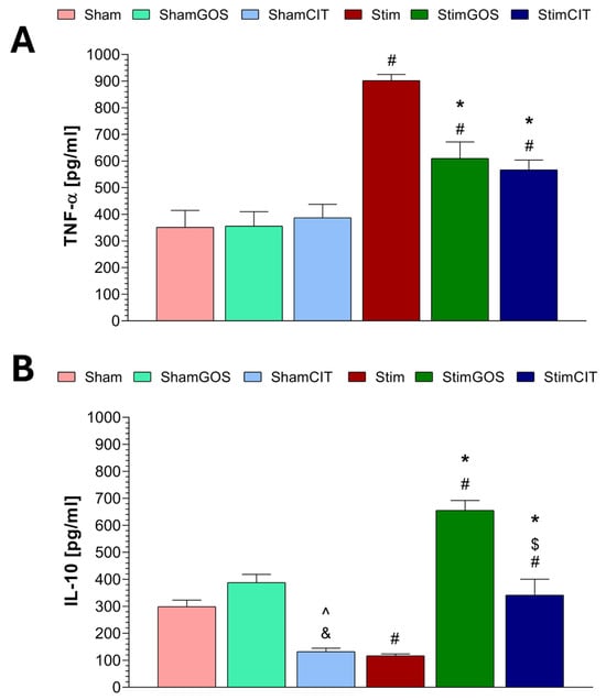 Effects of GOS supplementation or CIT administration on tumour necrosis factor alpha (TNF-α) (A) and interleukin 10 (IL-10). (B) Concentrations in the plasma of rats subjected to long-term electrical stimulation of the CeA or sham stimulation. Data are expressed as the mean ± SEM; n = 8 animals/group. Explanations: # p < 0.05 stimulated vs. sham rats within the same supplementation group (Stim vs. Sham; StimGOS vs. ShamGOS; StimCIT vs. ShamCIT); * p < 0.05 certain stimulated and supplemented groups vs. Stim; $ p < 0.05 StimGOS vs. StimCIT; & p < 0.05 certain sham-stimulated and supplemented groups vs. the Sham group; ^ p < 0.05 ShamGOS vs. ShamCIT using two-way ANOVA followed by Tukey’s post hoc test.